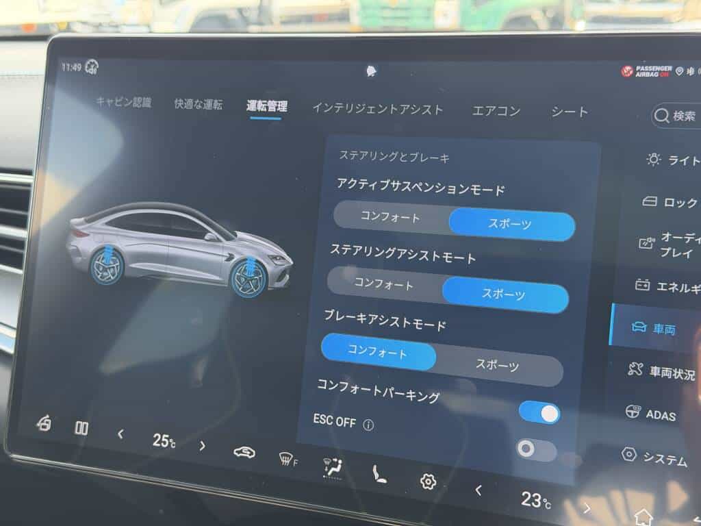 DiSusの説明はこのくらいにして、早速新型SEALを乗り回してみることに。ある程度のスピードを出してみたいので、とりあえずDiSus-Cをコンフォート(柔らかめ)の設定にしてBYD Auto新潟を出て新潟西パイパス方面へ向かう。