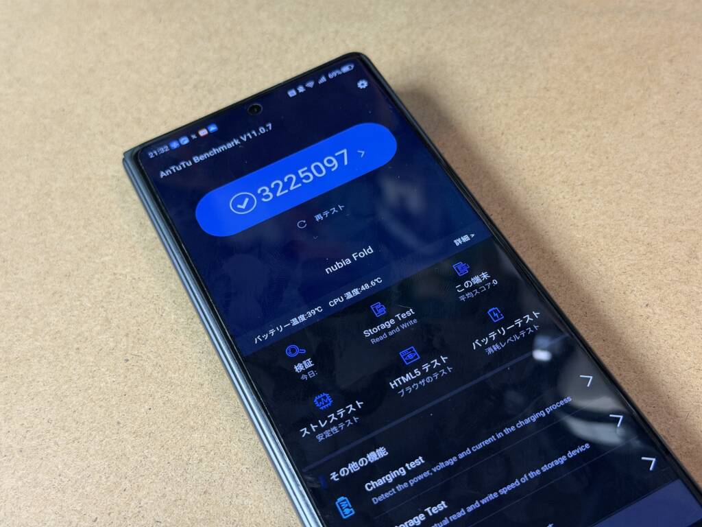 また、ベンチマークを回してみると、折りたたみスマホの中ではトップレベルのパフォーマンス持続性を持つ。高負荷なAntutuベンチマーク(Ver.11)を3回動かしても320万点前後のスコアを維持した。