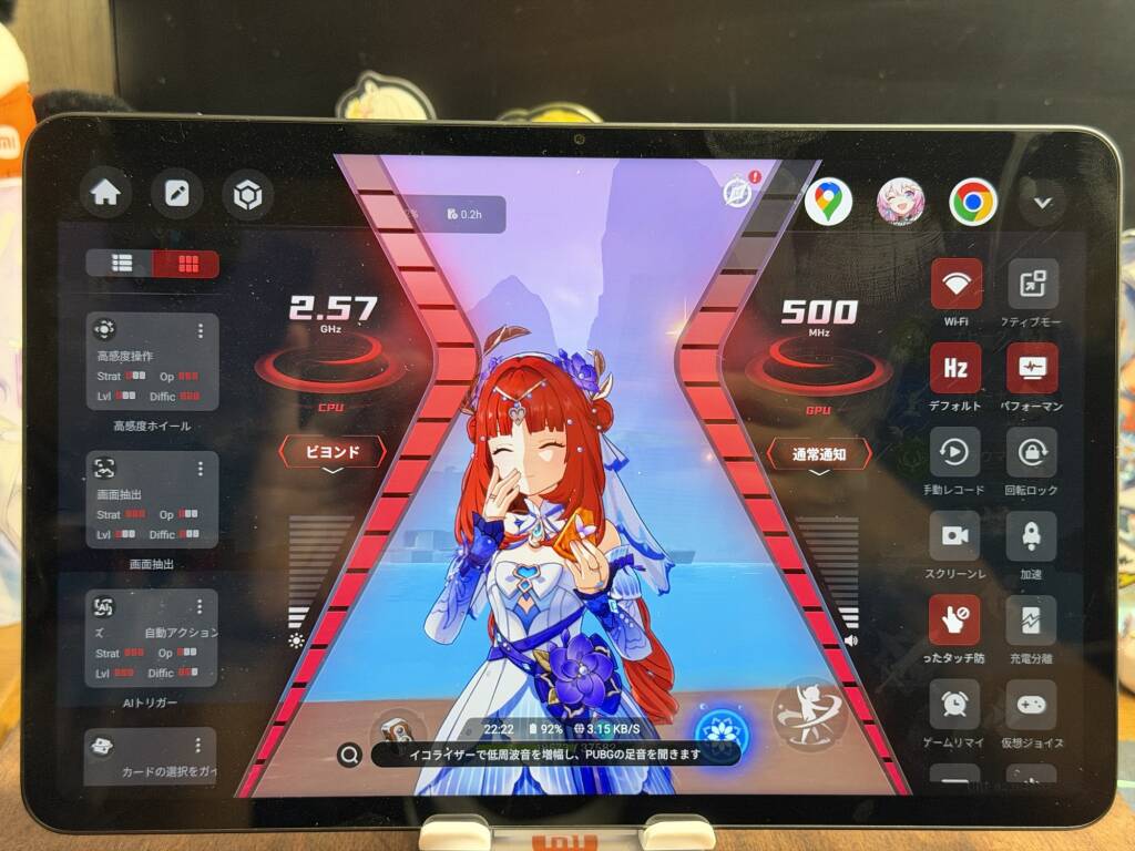 ただし、背面中央やカメラ周辺部には熱を感じることがあった。長時間利用時にはやや熱さを感じやすいポイントも感じられた。また、nubia Pad ProはREDMAGIC 系にも見られるゲーム補助機能(クロック値固定、表示最適化、フローティング UI など)が豊富に用意されており、ゲームユーザー視点での使い勝手はよい。