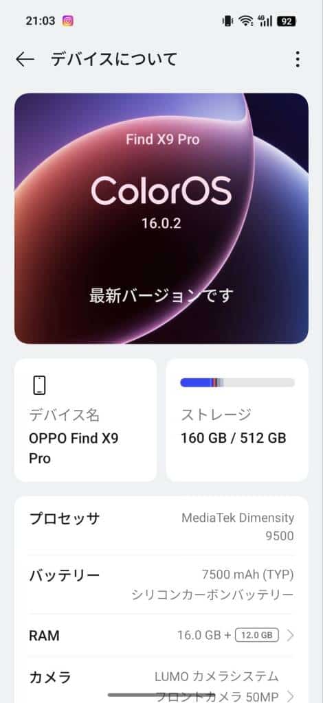 OSはAndroid 16ベースのColor OS 16が採用されている