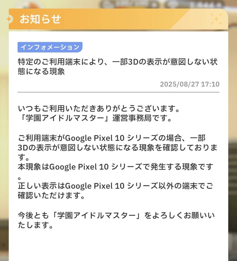 また、原神はPowerVR GPUへの非対応を正式に表明しており、学園アイドルマスターも現状発生している描画エラーについて「Pixel 10シリーズ以外の環境なら発生しない」と表明するなど、ゲームベンダー側の対応もかなり後手になっている。