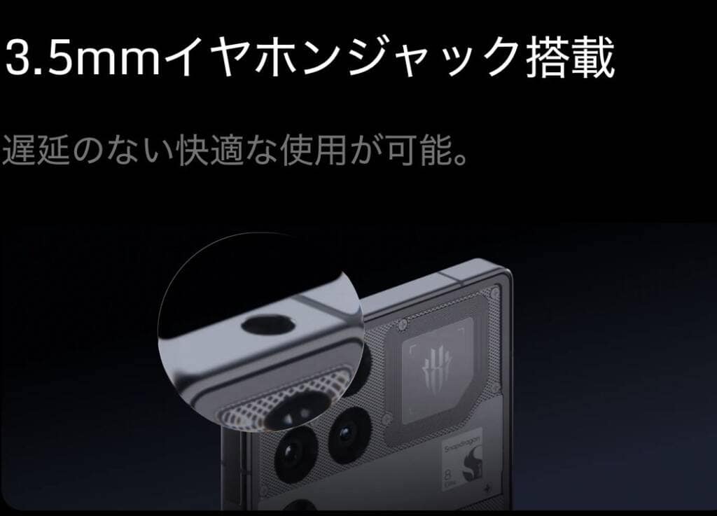 また、本機種はゲーミングスマホらしく有線イヤホンジャックも備える。日本向けで防水、イヤホンジャック、おサイフケータイを備えるハイエンドスマホは数少ない。