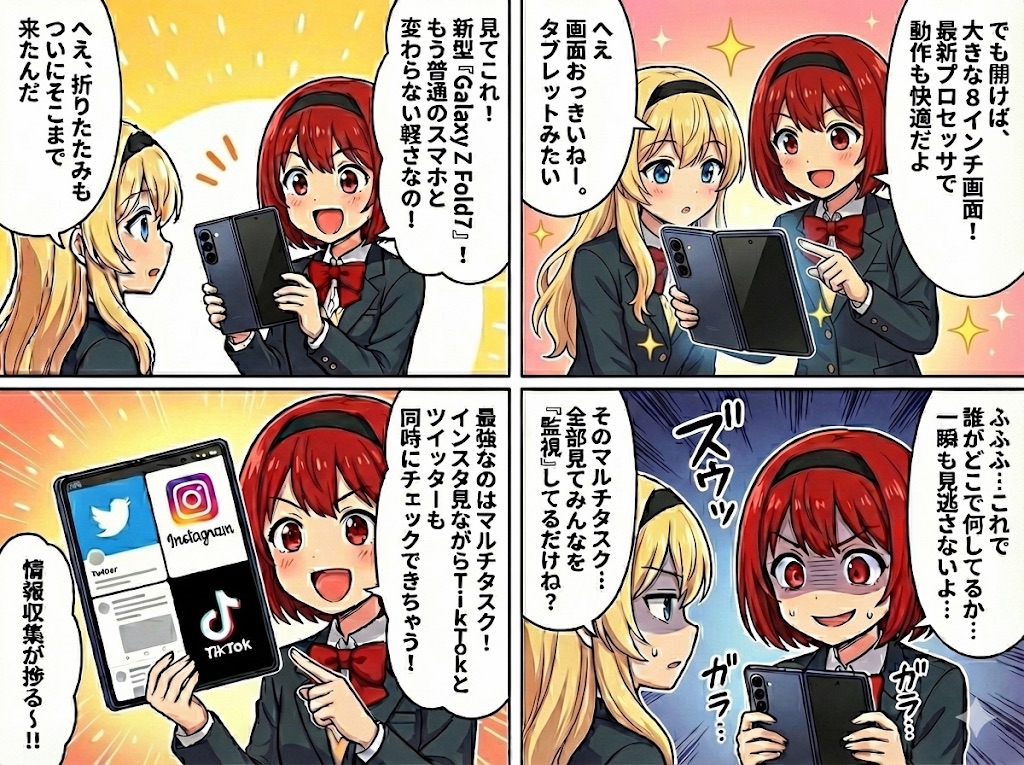 サムスンが送り出した次世代折りたたみスマートフォン「Galaxy Z TriFold」は、3枚のディスプレイを折り畳む“三つ折り”構造を採用した意欲作だ。 そんなスマホにマニアのマホ、SNS映えを求めるインフルエンサーのユキが関心を持たないわけがなかった。ついには発売に合わせてひと目見に行こうとしてしまう。 -