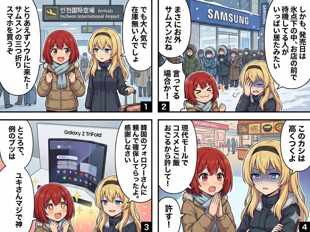 三つ折りスマホ「Galaxy Z TriFold」を求めていつもの二人は韓国へ向かった。ユキの友達に頼み込み、なんとか確保できたようだ。今回は第2、3話をまとめてお届け。 苦... -