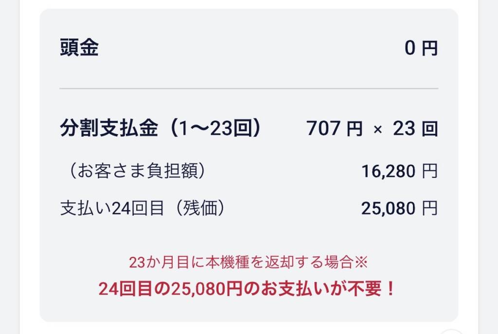 結果として、一括価格は4万1360円。さらに2年後に端末を返却する「いつでもカエドキプログラム」適用時は、残債2万5080円が免除され、実質負担額は1万6280円となる。